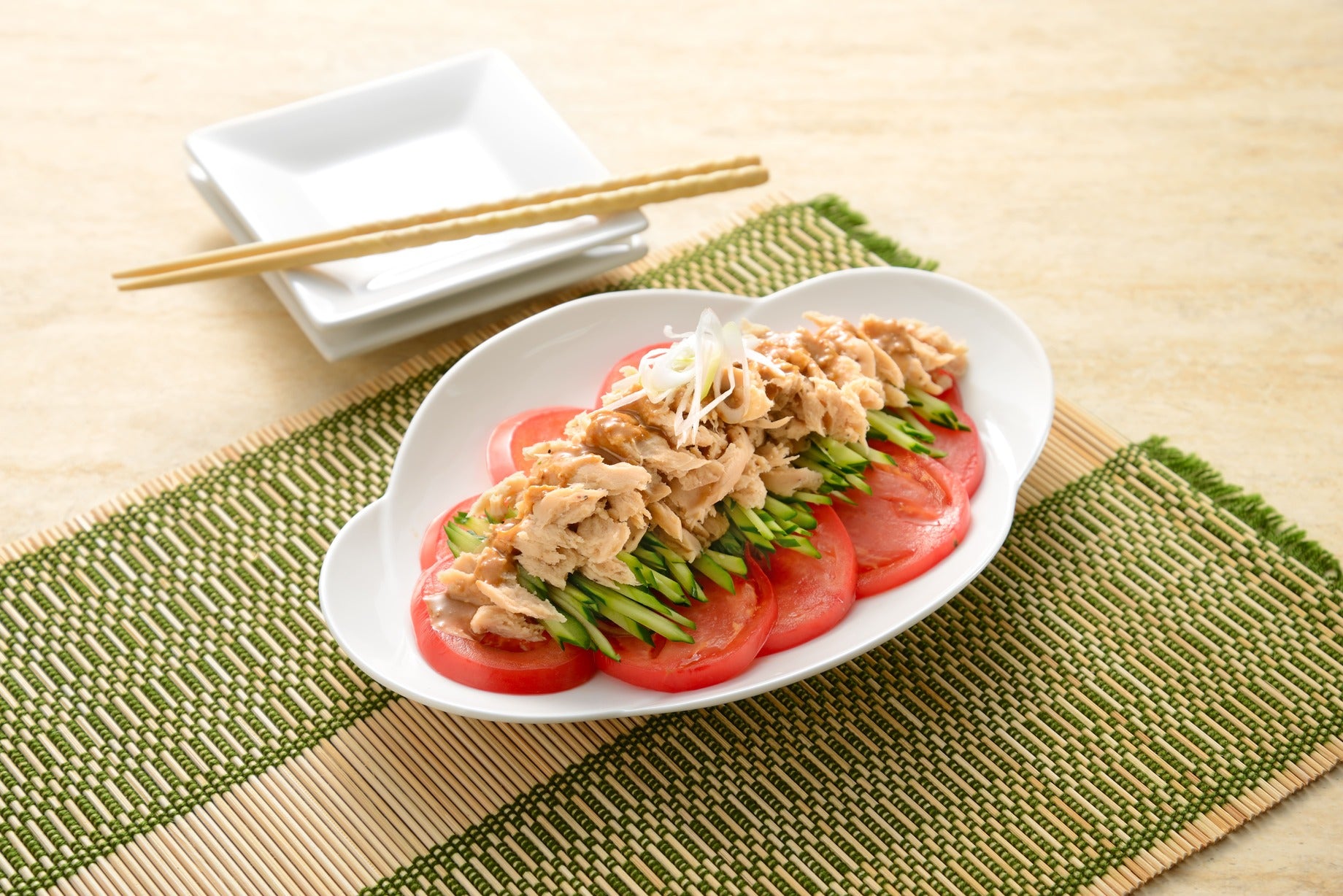 ③お皿にトマト、きゅうり、グリーンチキンの順に盛り Ⓐのタレをかけて長ねぎをのせる。