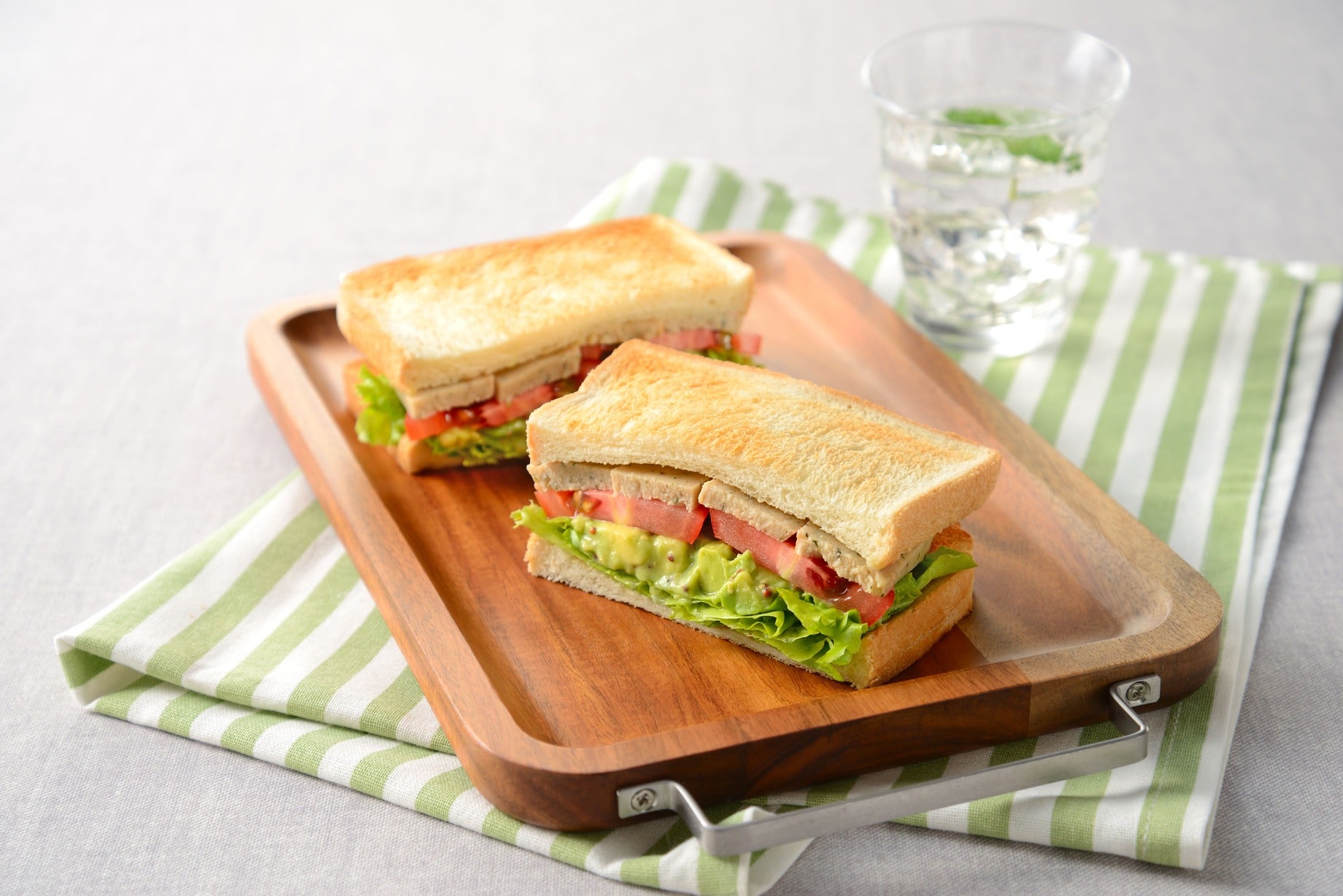 ⑤食パンにフリルレタス、アボカドソース、トマト、グリーンチキンの順にのせ、 食パンをのせて半分に切る。